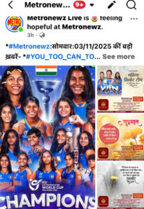 *#Metronewz:सोमवार:03/11/2025 कीं बड़ी ख़बरें- *#YOU_TOO_CAN_TOP* *#Metrosoft.app* *भारत ने रचा इतिहास, जीत लिया विमेंस वनडे वर्ल्ड कप:साउथ अफ्रीका को 52 रन से हराकर चैंपियन बने; दीप्ति-शेफाली ने जिताया फाइनल* *'यह जीत हर भारतीय के लिए गर्व का क्षण, नई पीढ़ी को मिलेगी प्रेरणा'; PM मोदी ने दी टीम इंडिया को बधाई।* *खजुराहो को मिलेगी वंदे भारत की सौगात... वाराणसी से होगी सीधे कनेक्ट, प्रधानमंत्री श्री मोदी करेंगे शुभारंभ।* *भारतीय सेना अरुणाचल के पहाड़ों में करेगी एक्सरसाइज: आर्मी, एयरफोर्स और नेवी नई युद्ध क्षमता को परखेंगे; ड्रोन और हाई-टेक सिस्टम का इस्तेमाल होगा।*